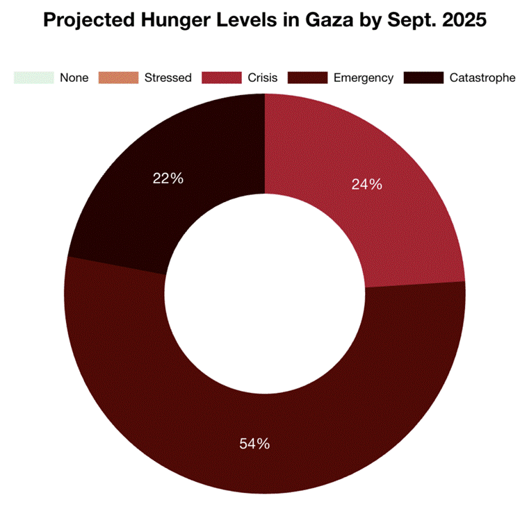 Hunger levels in the Gaza Strip projected to Sept. 2025. Based on a report published in May 2025. “Crisis” means that 0.5 - 0.99 per 10,000 people die each day. “Emergency” means that 1 - 1.99 per 10,000 people die each day. “Catastrophe” means that more than 2 per 10,000 people die each day. Anything above “crisis” indicates a significant daily caloric deficit below the recommended 2,100 kcal per day. Source: IPC (Integrated Food Security Phase Classification).