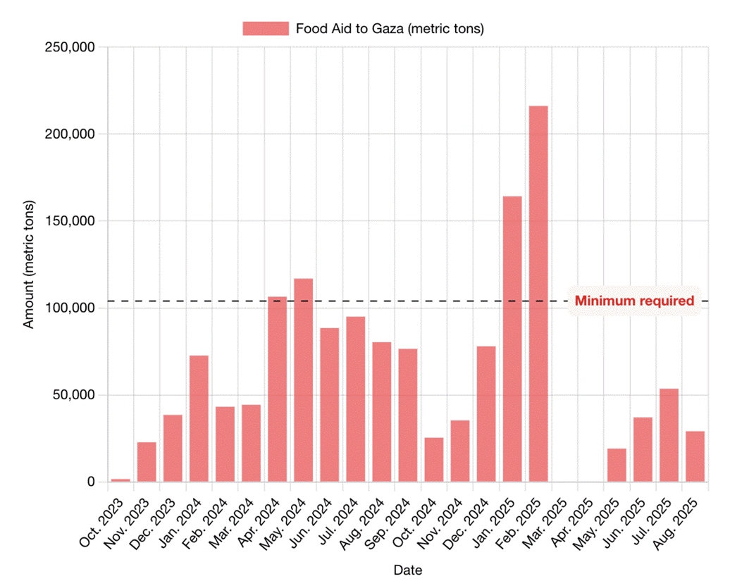 Food aid allowed into the Gaza Strip since October 2023. The minimum required aid is an estimate of how much aid is necessary to sustain 2.1 million Gazans (eating an average of 1.6 kilograms of food per day). Source: COGAT (Coordinator of Government Activities in the Territories).